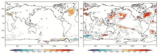 Correlation between the SPEI and sea surface temperature (HadISST1). (A) Relationship between the reconstruction and July-June HadlSST1(1870–2013) p < 10%; (B) Relationship between the reconstruction and July-June HadlSST1(1981–2010) p < 10%.
