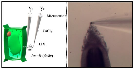 Schematic diagram and measured photo of Ca2+ flux analysis by non-invasive micro-tests. The diagram is to demonstrate the principles behind NMT testing and is not to scale. The tip diameter of the microsensor is about 5 μm.