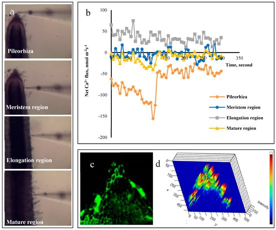 Net Ca2+ flux was measured using non-invasive micro-test technology (Physiolyzer, Younger USA LLC, Amherst, MA 01002, USA; Xuyue (Beijing) Sci. & Tech. Co., Ltd., Beijing, China). NMT non-invasively measures Ca2+ fluxes with a high temporal and spatial resolution. It measures the concentration gradient of Ca2+ by means of selective microsensor oscillation between two points in the root tip of P. edulis seedlings (Figure 2).