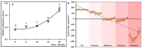 Ca2+ flux of the pileorhiza cells of P. edulis seedlings under different durations of PEG-treatment. (a) The relative conductivity of leaves from P. edulis seedlings treated with PEG-simulated drought stress for 5 min, 10 min, 15 min, and 30 min (Data Repetition: 6 replicates). The control (CK) is represented by 0, which was a control group incubated with distilled water. The dashed curve (y = 0.0132x2 − 0.0406x + 0.2171, R² = 0.9615) represents the linear regression model for relative conductivity and PEG-simulated drought stress. (b) The depth of the red color represents the length of treatment time with 20% PEG simulating drought stress. From left to right in Figure 4b: the CK group, PEG-simulated drought stress treatment for 5 min, 10 min, 15 min, and 30 min, respectively. The flux data for each treatment in the figures reflected the steady-state real-time flux of maximum response to Ca2+ under drought stress (Data Repetition: 3 replicates); each segment of real-time data comprises flux data for three minutes.
