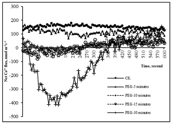Ca2+ flux in the pileorhiza of P. edulis seedlings in the control group (CK) maintained an out-of-range value of approximately 152 nmol m−2 s−1. Figure 5 showed that Ca2+ flux in the pileorhiza was only slightly changed in the experimental group after 5 min of PEG treatment, indicating that the slight degree of drought stress did not significantly induce the stress response leading to Ca2+ signaling in such a short time. When treated with PEG for 30 min, the Figure 5 shows a “V-shaped” pattern of ion uptake, with net flux first increasing and then decreasing. As drought stress time increased, Ca2+ flux gradually returned to control group standard of efflux. It is evident that there is a positive correlation between Ca2+ signal and drought stress time (Figure 5). Under drought stress, there is a “stress threshold” for the Ca2+ signal response. When the stress level reached this threshold, the Ca2+ flux at the pileorhiza underwent significant changes, which may be related to the plant’s ability to withstand drought stress.