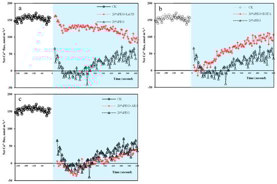 To determine the factors affecting Ca2+ transport, Ca2+ flux in P. edulis root tip treated with a calcium antagonist and ABA was measured using NMT. As shown in Figure 6a, LaCl3 was applied to the P. edulis seedlings treated with PEG-induced drought stress. The LaCl3 treatment significantly impeded extracellular Ca2+ influx at the pileorhiza compared to the experimental group without LaCl3. Extracellular Ca2+ channels were involved in Ca2+ fluid transport. The extracellular Ca2+ in seedlings could enter cells through Ca2+ channels under drought stress, which was one of the reasons for the increase of cytoplasmic Ca2+ concentration.