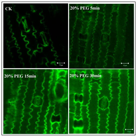 CK is the Ca2+ fluorescence map of the lower epidermal cells treated with distilled water. Under normal water conditions, Ca2+ was mainly localized within the cell walls of guard cells, accessory cells, and long cells in P. edulis seedling leaves. Ca2+ was less commonly found to be distributed in the cytoplasm. As drought stress duration increased, Ca2+ concentration in the cytoplasm increased, except for in tethered cells. Among them, Ca2+ in long cells and guard cells increased significantly. The fluorescence intensity in the cytoplasm was also higher than that of the CK. Fluorescence intensity in the cytoplasm of accessory cells did not significantly increase. There were particularly pronounced differences in Ca2+ distribution in the 30 min PEG treatment. In addition to in tethered cells, the cytoplasmic fluorescence in all living cells, including guard cells, increased. Our results suggest that Ca2+ signals in response to PEG stress reflect distinct cellular Ca2+ dynamics.