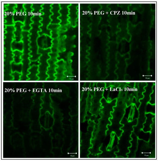 In addition to chemical signal root transduction, drought stress triggered Ca2+ movement in leaf cells. Ca2+ may regulate leaf stomatal movement to control transpiration and respiration, as a self-protection and adaption measure in response to environmental stress. To simultaneously monitor cell-specific Ca2+ P. edulis seedling leaves, we used a confocal microscope to record Ca2+ fluorescence localization (Figure 7).