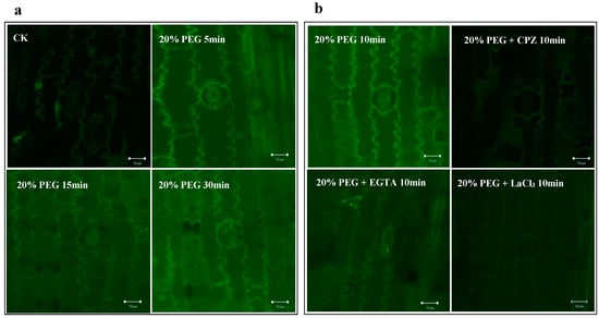 H2O2 fluorescence in P. edulis seedling leaves under drought stress. The green fluorescence intensity in the figure represents concentration of hydrogen peroxide, with more fluorescence indicating a higher concentration of H2O2. (a) H2O2 fluorescence localization at different treatment times (5 min, 15 min, and 30 min) using 20% PEG-induced drought stress. (b) The samples were treated with different Ca2+ inhibitors (CPZ, EGTA, and LaCl3) for 10 min under 20% PEG-induced drought stress.