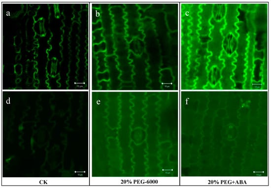 Localization of fluorescence of Ca2+ and H2O2 in mesophyll cells after application of exogenous ABA under drought stress. (a) Calcium-fluorescence localization of leaves of P. edulis seedlings with distilled water. (b) Calcium-fluorescence localization of leaves of P. edulis seedlings under 20% PEG 6000-induced stress for 10 min. (c) Calcium-fluorescence localization of leaves of P. edulis seedlings with the application of 30μmol/L ABA to 20% PEG-induced stress for 10 min. (d–f) H2O2 fluorescence localization under the same treatment as above.