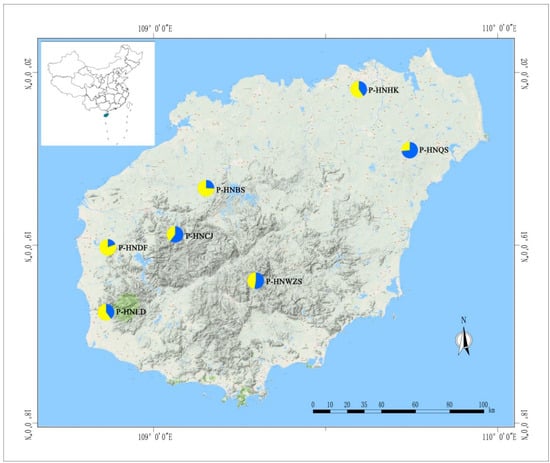 Geographic location of seven investigated D. odorifera populations collected from Hainan Island in China. P-HNQS—population of Wenchang city and Sansha city in Hainan province, P-HNHK—population of Haikou city, P-HNBS—population of Baisha city, P-HNDF—population of Dongfang city, P-HNLD—population of Ledong autonomous county, P-HNCJ—population of Changjiang autonomous county, P-HNWZS—population of Wuzhisan city. The pie charts estimated genetic structure of the seven populations based on STRUCTURE analysis with cluster number of two, in each chart, different color represents a different cluster accounted in each population.