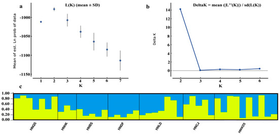 An admixture model-based approach was implemented to evaluate the population structure of the 42 D. odorifera individuals. The optimum cluster number (K) of the investigated populations was two, with the largest values of both ln P(D) (log probability of data, −978) and delta K (15) harvested from the STRUCTURE HARVESTER website (Figure 2a,b). Based on K of two, a graphic representation of estimated membership coefficients of each individual was exhibited in Figure 2c. Each color showed the proportion of membership of each individual, represented by a vertical line, to the two clusters. The individual with the probability higher than a score of 0.75 was considered a pure one, and lower than 0.75 an admixture one. In this analysis, the yellow cluster included 17 individuals with 14 pure and 3 admixture ones, while the blue cluster included 25 individuals with 14 pure and 11 admixture ones. However, only HNBS and HNDF entirely consisted of individuals from the blue cluster, other populations consisted of individuals from both clusters.