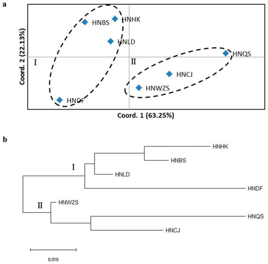 The pairwise G’ST matrix was used for the principal coordinate analysis (PCoA). The first and second axis explained 63.25% and 22.13% of the variance within the molecular data, respectively (Figure 3a). Two clusters were clearly distinguished by PCoA analysis: Populations from HNHK, HNBS, HNLD and HNDF were grouped as cluster I, the other three populations (HNQS, HNCJ and HNWZS) grouped as cluster II. Moreover, the NJ (Neighbor-joining) dendrogram tree showed similar results based on Nei’s unbiased genetic distance among the investigated populations (Figure 3b).