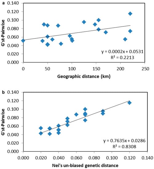 Subsequently, Mantel tests between the matrixes of pairwise G’ST and geographic distance (Figure 4a) and genetic distance (Figure 4b) were carried out, respectively. The results showed that genetic differentiations among the investigated populations were more attributed to the genetic distance (91.2%, Figure 4b) rather than to the geographic distance (27.7%, Figure 4a). Hence, there was no clear geographic origin-based structuring, or predominate isolation by distance among the investigated populations.