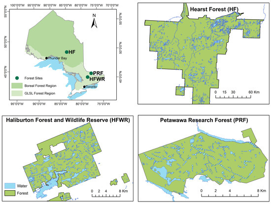 We conducted our research across three forest sites in northern and central Ontario, Canada to capture some of the diversity that exists within Ontario’s managed forest ecosystems (Figure 1). One forest site is representative of the boreal forest region (i.e., Hearst Forest (HF)) and two sites represent the GLSL forest region (i.e., Petawawa Research Forest (PRF) and Haliburton Forest and Wildlife Reserve (HFWR)), the transitional zone between the northern boreal forest and the eastern deciduous forest of North America. Even though PRF and HFWR are both in the GLSL forest region, they do differ in terms of species composition. Due to differences in annual precipitation, soils, and management practices, PRF tends to be dominated by conifer species while HFWR is more hardwood dominated. For forest management planning purposes, Ontario recognizes eight provincial forest types that have been grouped by ecological and site characteristics such as species composition and ecosite: (i) white and red pine (white and red pine mixedwood stands); (ii) jack pine; (iii) upland conifers (predominantly mixed spruce, jack pine, and fir stands on upland sites); (iv) lowland conifers (predominantly black spruce stands on low, poorly drained sites); (v) mixedwood (mixed stands containing spruce, jack pine, fir, poplar, and white birch); (vi) poplar; (vii) white birch; and (viii) tolerant hardwoods (predominantly maple and oak). Variability does exist within these forest types, e.g., mixedwoods and tolerant hardwoods are more heterogeneous than jack pine. This can be attributed to varying stand development and seral stages, stand age, understory species composition, natural disturbances, and the impact of silvicultural practices. The three study sites overlap in provincial forest types to some extent, i.e., forested wetlands (lowland conifers), spruce forests (upland conifers), intolerant hardwoods (poplar and white birch), and mixedwoods stands can be found at all three sites. However, these forest types and sites are managed differently, i.e., spruce forests are managed at HF and unmanaged at HFWR. Tolerant hardwoods are only found in the GLSL forest region sites and the pine forest types are only encountered at HF and PRF.