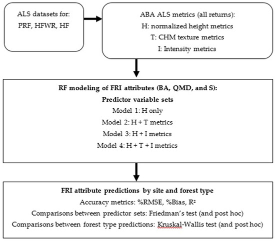 Our major analyses are summarized in Figure 2. First nonparametric models were constructed to predict BA, QMD, and S at our three sites using four different sets of ALS metrics as predictor variables. With the four sets of predictor variables we set out to test whether BA, QMD and S predictions in boreal and GLSL sites improved with additional characterization of the upper canopy (also known as texture) and/or additional characterization of canopy permeability (also known as intensity). We then assessed the performance of these four RF models in each study site and at the forest type level using %RMSE, %Bias, and R2. Lastly, we tested if the prediction errors on the site and forest type level were significantly different from each other using Friedman’s and Kruskal–Wallis tests.