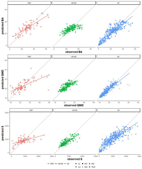 where N is the number of validation plots, yi is the observed value for plot i, ŷi is the predicted value for plot I, and ȳ is the mean of the observed variable, i.e., BA, QMD, or S.