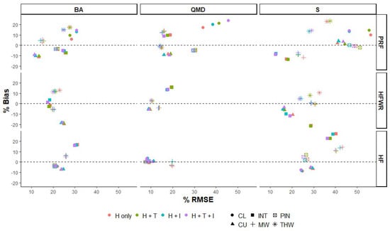 %RMSE and %Bias of the RF models using different predictor variable sets (H only: normalized height metrics; H+T: normalized height and CHM texture metrics; H+I: normalized height and intensity metrics; and H+T+I: normalized height, CHM texture and intensity metrics) by FRI attribute (top: BA, QMD, and S), forest site (right: PRF, HFWR, and HEF) and provincial forest type (CL (●), CU (▲), INT (■), MW (+), PIN (