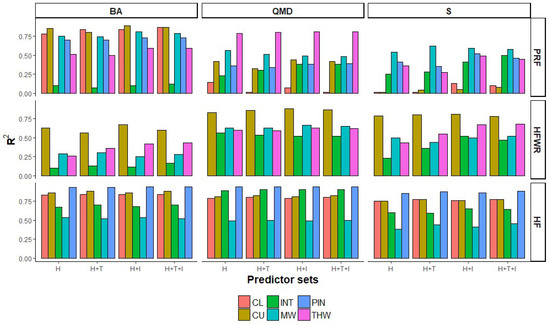 When prediction accuracy metrics were compared among the three sites, no trends were observed, i.e., %RMSE’s for all FRI attributes were lowest in HFWR, the lowest %Bias values were observed in PRF (BA) and HFWR (QMD and S), and R2’s for all FRI attributes were highest in HF, regardless of which predictor variable sets used. The Friedman’s test indicated that none of the distributions of our FRI prediction errors significantly differed from each other (p > 0.05) (Table 5).