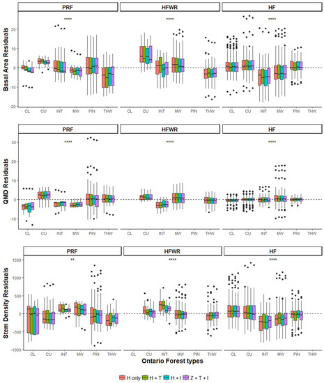 When we tested for differences in BA, QMD and S prediction errors between forest types, all three FRI variables and sites showed significant differences (p < 0.01 to p <= 0.0001) (Figure 6). The Mann–Whitney U post hoc tests indicated that pairwise differences between forest types varied within and between sites for the three FRI attributes. However, in HF and HFWR we observed more significant differences between forest types than in PRF (Table A2).