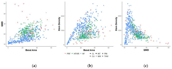 Relationships between the three observed FRI attributes (BA, QMD, and S) per forest site (PRF (orange), HFWR (green), HEF (blue)), and provincial forest type (CL (●), CU (▲), INT (■), MW (+), PIN (