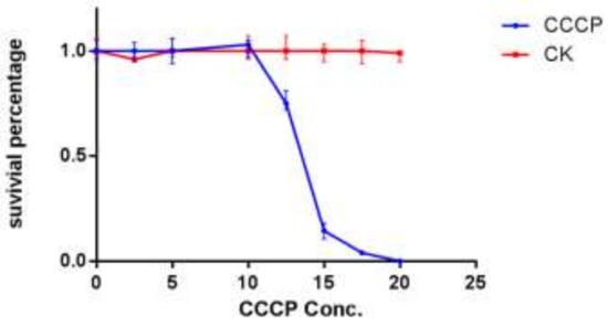 Minimum bactericidal concentration test of the uncoupler CCCP (carbonyl cyanide m-chlorophenyl hydrazine) to Smal-007. The survival rate of Stenotrophomonas maltophilia Smal-007 after 48 h of exposure to CCCP at different concentrations were recorded. CK represents survival rate of control group without CCCP. X-axis represents concentration of CCCP (μg/mL) and Y-axis represents the survival rate of Smal-007.