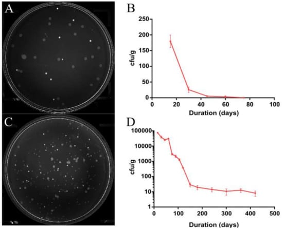 GFP-labeled Smal-007 was sprayed on pine trees and recovered in one year. The GFP-marked Smal-007 could be easily discriminated from other bacteria recovered, by the clear fluorescence upon excitation (Figure 5A,C). The number of surviving Smal-007 was counted. It was shown that at the initial stage of colonization (the 15th day), Smal-007 recovered from needles and bark were approximately 170 CFU/g and 76,800 CFU/g, respectively. After that, the number of Smal-007 recovered decreased gradually. On the needles, no Smal-007 was recovered on the 75th day (Figure 5B). On the bark, the number of Smal-007 decreased to ~150 CFU/g and kept around this number until the 420th day, which was the end of the test (Figure 5D). These results indicated that Smal-007 could colonize pine bark stably.