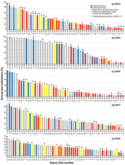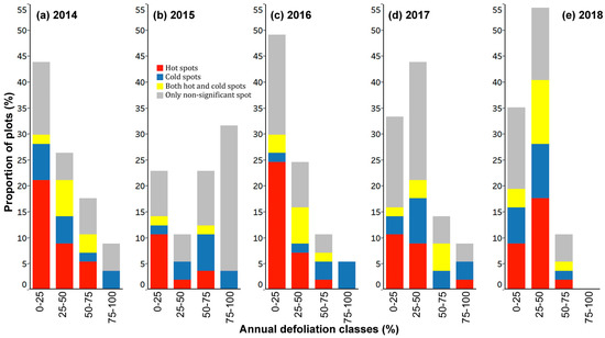 - Plots with severe defoliation generally tended to exhibit cold spot trees, and plots with light defoliation tended to have hot spot trees, because whether defoliation was high or low enough to be a hot or cold spot depended on the defoliation level of the entire plot.