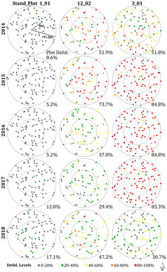 3.3. Spatial Patterns of Current Year Defoliation for Plots