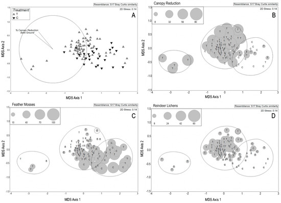 Control plots and most treatment plots form one large cluster on the NMDS ordination, with most control plots positioned to the right and most treatment plots to the left. Treatment plots are associated with increasing bare ground and greater canopy removal (as vectors—Figure 1A,B). Treatment plots are significantly different from control plots (PERMANOVA - p = 0.001), and form three significant groups (SIMPROF at 65% similarity). All treatment plots except five outliers form a central cluster, with four plots included in a cluster to the left of the ordination. These four plots all have high amount of bare ground and little abundance of bryophytes and lichens. Feather mosses dominate in control plots and decrease in treatment plots (Figure 1C), while reindeer lichens have higher abundance in the treatment plots compared to the control plots (Figure 1D).