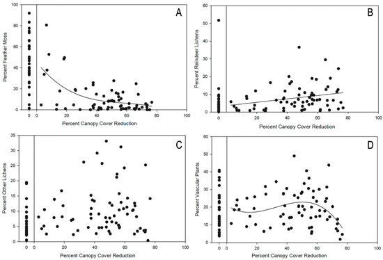 Regression of percent cover of: (A) feather mosses, (R2 = 0.340, p < 0.0001, f = 45.2 + (−1.8)*x + 0.03*x2 + (−0.0002)*x3). (B) Reindeer lichens (R2 = 0.070, p = 0.028, f = 3.6 + 0.1*x). (C) Other lichens (p = 0.199). (D) Understory vascular plants (R2 = 0.12, p = 0.043, f = 21.2 + (−0.6)*x + 0.03*x2 + (-0.0003)*x3) in treatment plots as a function of percent reduction in canopy cover in pine-moss-lichen forests in western Alberta, Canada. Variation in the percent cover of the variable in control plots is shown to be left of regression and was not included in the regression analysis.