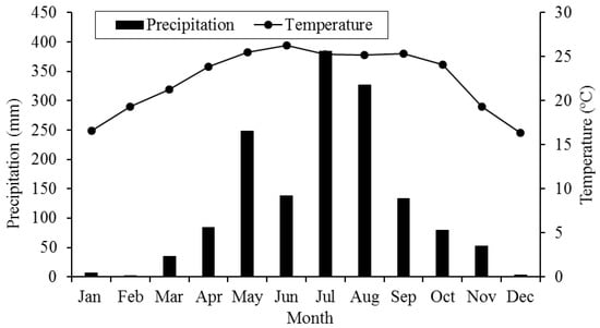 Measured monthly precipitation (mm) and temperature (°C) at the study site.