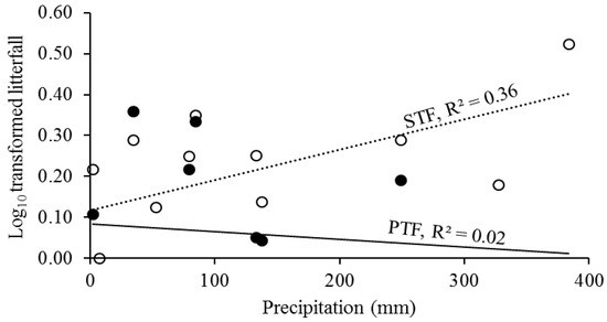 Litterfall in relation to precipitation. Solid circles represent the site primary tropical forest (PTF) and empty circles the site secondary tropical forest (STF).