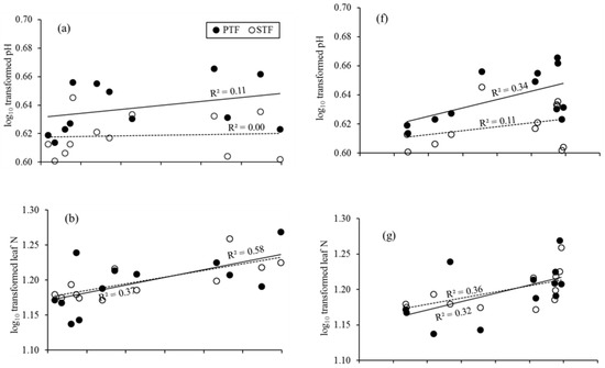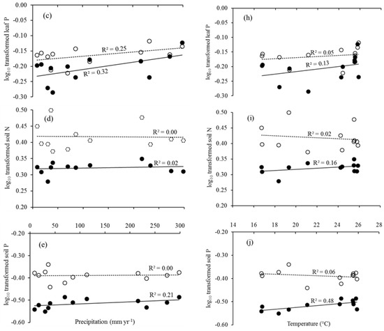 There were relatively higher variances (CV, %) in leaf litter N and P in the PTF, indicating the presence of monthly irregular fluctuations. In contrast, low variance in the STF indicates that the monthly variation was little (Table 1). The higher variances in the PTF was likely associated with precipitation regime (Figure 3) and favor faster litter decomposition. Leaf litter N was significantly related to precipitation in both the dry and rainy season in the STF (Figure 4). Senesced-leaf litter N and P were generally significantly related to mean annual temperature and mean annual precipitation, but temperature appears to be a partial driver of variations in senesced-leaf litter N and P assessed from a global large dataset [15].