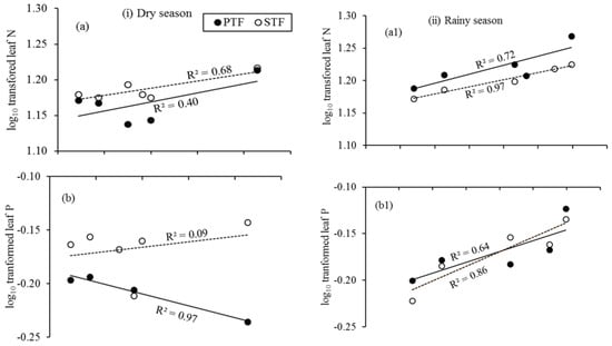 Leaf litter N (a,a1) and P (b,b1), and soil N (c,c1) and P (d,d1) in the (i) dry and (ii) rainy season. Solid trend lines represent the site PTF and dotted lines the site STF.
