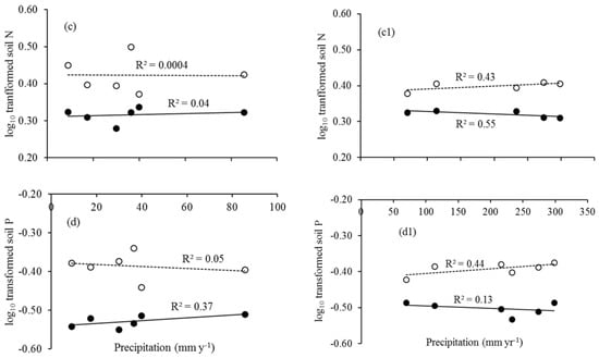 Our data showed that there were no relationships between soil N and precipitation, as well as soil P and precipitation (Figure 3). Soil properties like pH, clay, and sand were also more important in explaining variation in total N and P than fine root density in the subsurface soils [20]. Soil parent materials could strongly modulate the N and P limitations [68,69] as well as soil nutrient availability under local and global scales [70]. The relationships between leaf litter N and P, and soil N and P were not detected in the study sites. This could be due to the changes in vegetation composition and precipitation limitation that together explained the variation in leaf litter nutrients at the local scale. However, in tropical ecosystems with low availability of N (especially in sandy soils) that are normally depleted in 15N, this pattern could be associated with the presence of N-fixing species [71].