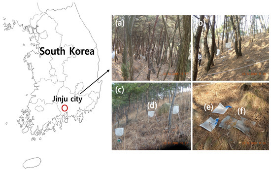 The incidence of pine wilt disease, a highly destructive forest disease in the world [10,11], can have considerable effects on nutrient cycling by litterfall and decomposition processes due to the death or damage of trees. For example, pine wilt disease and the associated management practices generate canopy caps and elevate light availability and temperature [12], which possibly stimulates the decomposition process on the forest floor [4,13]. They also affect soil properties, such as water-holding capacity, and other influential factors affecting litter decomposition. The mortality of the infected trees leads to a decrease in litterfall as a result of the reduced tree density [5]. In addition, wood debris, such as dead logs, branches, and stumps, collects on the forest floor during the removal of infected trees; the removal of infected trees is one of the most important control strategies for pine wilt disease disturbed forests in Korea [5,14]. However, since information along the gradient of infection is scarce, it is difficult to evaluate the quantitative changes in nutrient inputs through litterfall and decomposition processes because of the spatial variation of infected pines in small-scale stands [12,15].