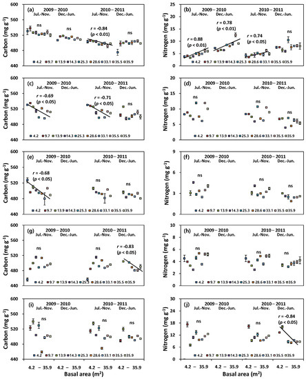 Correlation between carbon and nitrogen concentration (n = 3) in litterfall components [(a,b) needle, (c,d) branches, (e,f) bark, (g,h) cones and flowers, (i,j) miscellaneous] and basal area in pine wilt disease disturbed stands. Vertical bars represent standard error. ns: non-significance.