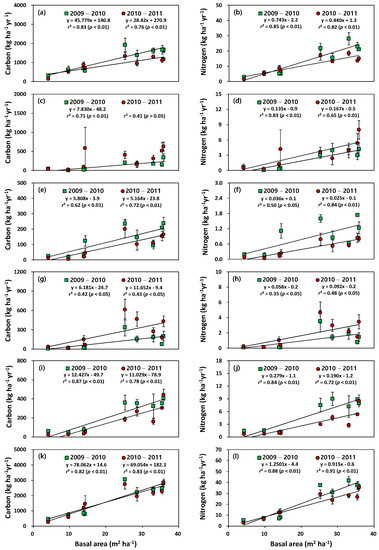 The linear regression analyses developed for the C and N inputs through litterfall components were significant (r2 = 0.42–0.91; p < 0.05), except for the C input in branch litter sampled in 2010–2011 (Figure 3). The C and N inputs through litterfall components decreased with decreasing basal area due to considerable differences in the basal areas. The best fit with the highest coefficient of determination (r2) was generally obtained for total litterfall, followed by needles, branches, miscellaneous, bark, and reproduction litter.