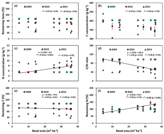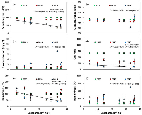Relationships between basal area and decomposition of needle litter [(a) remaining mass, (b) carbon and (c) nitrogen concentration, (d) C/N ratio, (e) remaining C and (f) N] in pine wilt disease disturbed stands (n = 3). Vertical bars represent standard error.