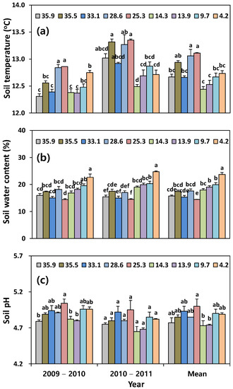 (a) Annual mean soil temperature, (b) soil water content, and (c) soil pH among basal area treatments in pine wilt disease disturbed stands (n = 3). The different letters among the basal area treatments for each year indicate significance at p < 0.05. The same color across the years denotes the same basal area treatment (disturbance intensity). Vertical bars represent standard error.