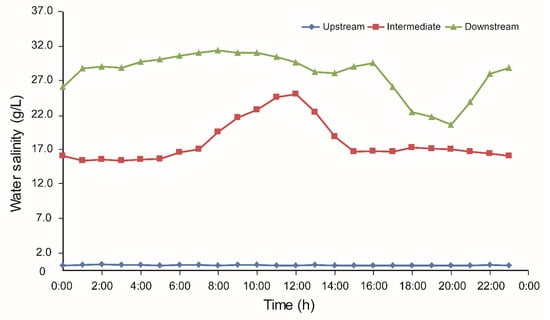 Typical diurnal change of the surface water salinity at the upstream site, intermediate site and downstream site of the Wenchang River, Hainan, China.