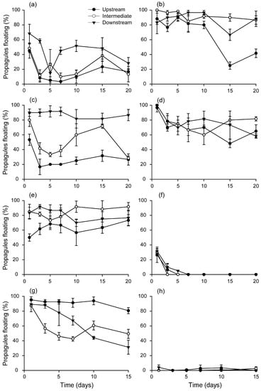 Corresponding to the changes in propagule densities, the buoyancy of the propagules changed with sites and floating times, and different species showed different trends (Figure 4). The buoyancy rate of the B. gymnorhiza and B. sexangula propagules at the downstream site was significantly higher than that at both the upstream and intermediate sites (p < 0.01) (Figure 4a,c). More than half of the B. sexangula propagules had lost their buoyancy after floating for 3 days at the upstream site and intermediate site; however, approximately 90% remained afloat at the downstream site (Figure 4c). After 1 day of floating, the buoyancy rate of the L. racemosa propagules decreased dramatically from 100% to 75% and then remained stable (Figure 4d). The buoyancy rates of the propagules of R. stylosa and C. tagal at the intermediate site and downstream site were higher than 80% and showed few changes during the entire floating experiment (Figure 4b,e). After 1 day of floating, only 30% of the propagules of A. corniculatum floated at all sites, and no propagule remained afloat after 7 days (Figure 4f). During the 15 days floating experiment, only a small portion of S. alba propagules remained afloat (Figure 4h). In our study, all of the mangrove species except S. caseolaris shared a common trend, i.e., the propagules had a higher buoyancy rate at the downstream site than at the intermediate or upstream site. At the downstream and intermediate sites, the buoyancy rate of S. caseolaris propagules decreased with an increase in floating time. After 15 days of floating, more than 50% of the propagules sank at both the intermediate site and downstream site, whereas approximately 90% of the propagules at the upstream site remained afloat (Figure 4g).