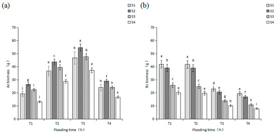 In the T1, T2, T3, and T4 treatments groups, salinity increased the biomass of A. corniculatum seedlings; they increased first and then decreased. The seedlings cultured in S2 had the highest value and in S4 had the lowest value (Figure 1a). However, the biomass of B. sexangula seedlings showed a decreased trend; the seedlings cultured in S1 had the highest value and in S4 the lowest value (Figure 1b). Because of the effect of flooding time on salinity stress, the biomass of A. corniculatum seedlings in the T3 treatment group under different salinity treatments was higher than that under corresponding salinity treatments in the T1, T2 and T4 treatment groups, and the decrease of A. corniculatum biomass in T3 flooding group were lower than those in the T1, T2, and T4 flooding groups. But in the T1 treatment group, the biomass of B. sexangula seedlings under different salinity treatments was higher than that under the corresponding salinity treatments in the T2, T3, and T4 treatment groups and the decrease of B. sexangula biomass in T1 flooding group were lower than those in the T2, T3, and T4 flooding groups.