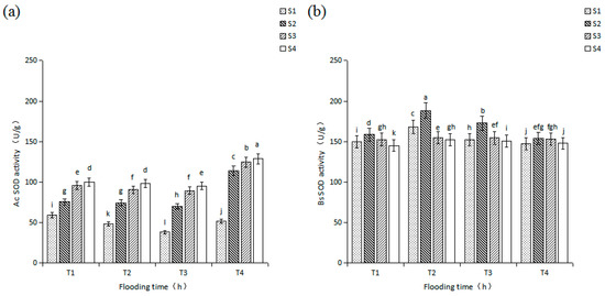 As flooding time increased, SOD activity in the leaves of A. corniculatum seedlings decreased first and then increased; the seedlings cultured in T3 had the lowest value and the seedlings cultured in T4 had the highest (Figure 2a). While SOD activity in the leaves of B. sexangula seedlings increased first and then decreased, the seedlings cultured in T1 had a lower value and the seedlings in T2 had the highest value (Figure 2b). Due to the effect of salinity on flooding stress, in the leaves of A. corniculatum seedlings, SOD activity of different flooding treatment in the S1, S2, and S3 salinity groups was lower than that of the corresponding flooding treatment in the S4 salinity group. But in the leaves of B. sexangula seedlings, SOD activity of different flooding treatments in the S1, S3, and S4 salinity groups was lower than that of corresponding flooding treatment in the S2 salinity group.
