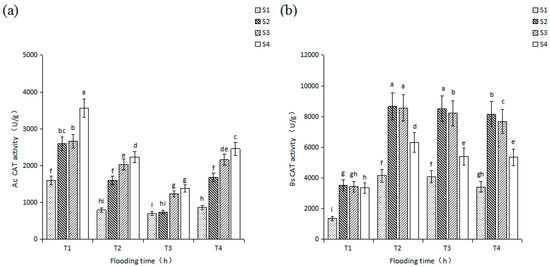 The changes of CAT activity in leaves of Ac and Bs seedlings under the effect of salinity and flooding time; Ac: A. corniculatum; Bs: B. sexangula; (a): The change of Ac seedlings CAT activity, (b): The change of Bs seedlings CAT activity; Flooding time treatment: T1:2 h, T2: 4 h, T3:6 h, T4:8 h; Salinity treatment: S1:10 ppt, S2:20 ppt, S3: 30 ppt, S4:40 ppt; Vertical bars are the standard errors. Different letters indicate significant differences (p < 0.05).