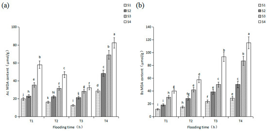 The changes of MDA content in leaves of Ac seedling under the effect of salinity and flooding time; Ac: A. corniculatum; Bs: B. sexangula; (a): The change of Ac seedlings biomass, (b): The change of Bs seedlings biomass; Flooding time treatment: T1: 2 h, T2: 4 h, T3: 6 h, T4: 8 h; Salinity treatment: S1:10 ppt, S2:20 ppt, S3: 30 ppt, S4:40 ppt; Vertical bars are the standard errors. Different letters indicate significant differences (p < 0.05).