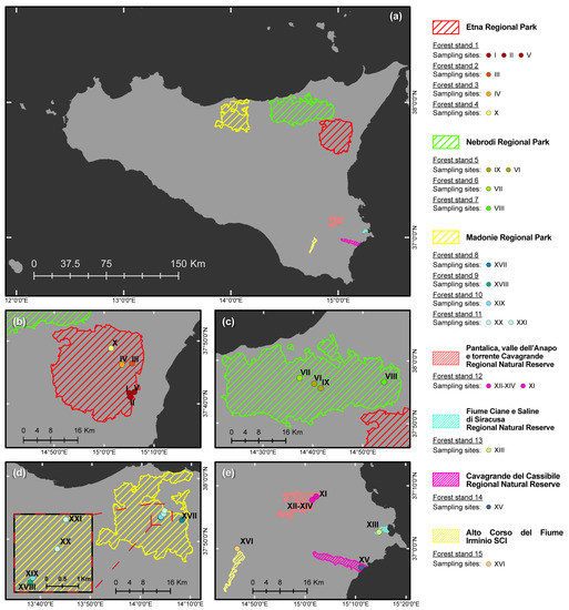 Geographical location of the 15 forest stands and the seven Protected Natural Areas included in the Phytophthora survey of natural forests in Sicily, projected using the Universal Transverse Mercator (UTM) (a). Location of the sampled forest sites within the Etna (b), Nebrodi (c), and Madonie (d) Regional Parks; and in the “Pantalica, valle dell’Anapo e torrente Cavagrande”, “Fiume Ciane e Saline di Siracusa”, “Cavagrande del Cassibile” Regional Natural Reserves and the “ITA080002—Alto Corso del Fiume Irminio” Site of Community Importance (SCI) (e).