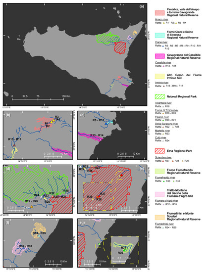 Geographical location of the nine Protected Natural Areas and the 14 river systems included in the Phytophthora survey of rivers in Sicily, projected using the Universal Transverse Mercator (UTM) (a). Riparian sampling sites (R) along the river systems running through: “Pantalica, valle dell’Anapo e Torrente Cavagrande” Regional Natural Reserve (RNR) and “ITA080002—Alto Corso del Fiume Irminio” Site of Community Importance (SCI) (b); “Fiume Ciane e Saline di Siracusa” and “Cavagrande del Cassibile” RNRs (c); “Nebrodi” (d) and “Etna” (e) Regional Parks; “ITA030019—Tratto Montano del Bacino della Fiumara d’Agrò” SCI and “Fiumedinisi e Monte Scuderi” RNR (f); and “Fiume Fiumefreddo” RNR (g).