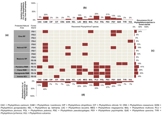 Distribution and diversity of Phytophthora species in sampled forest stands from Protected Natural Areas in Sicily. (a) Etna RP = Etna Regional Park; Nebrodi RP = Nebrodi Regional Park; Madonie RP = Madonie Regional Park; Pantalica RNR = Pantalica, Valle dell’Anapo e Torrente Cavagrande Regional Natural Reserve (RNR); Ciane RNR = Fiume Ciane e Saline di Siracusa RNR; Cavagrande RNR = Cavagrande del Cassibile RNR; Irminio SCI = ITA080002—Alto corso del Fiume Irminio Site of Community Importance (SCI), (b) isolation frequency (%) of Phytophthora species from Phytophthora-positive soil samples, (c) occurrence (%) of Phytophthora species in sampled forest stands, (d) distribution (%) of Phytophthora species in the sampled forest stands.