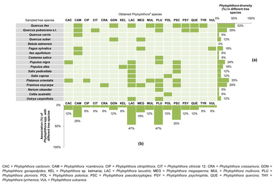 Association of Phytophthora species with different tree species in Protected Natural Areas in Sicily. Dark-green color represents a Phytophthora—host tree association, (a) diversity of Phytophthora species in different tree species (in % of all Phytophthora species found), (b) association of Phytophthora species with the sampled tree species (in % of all tree species sampled).