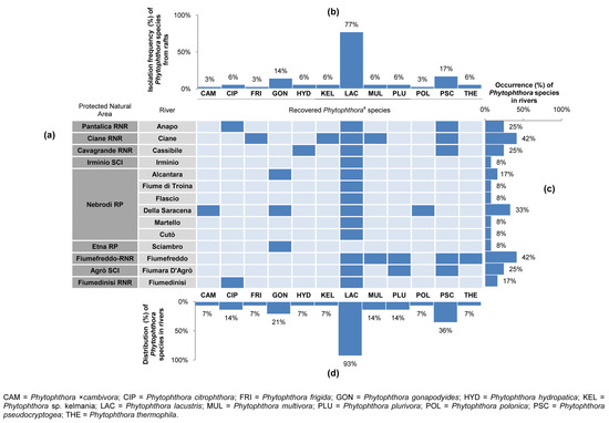 Distribution and diversity of Phytophthora species in sampled rivers from Protected Natural Areas in Sicily. (a) Etna RP = Etna Regional Park; Nebrodi RP = Nebrodi Regional Park; Madonie RP = Madonie Regional Park; Pantalica RNR = Pantalica, Valle dell’Anapo e Torrente Cavagrande Regional Natural Reserve (RNR); Ciane RNR = Fiume Ciane e Saline di Siracusa RNR; Cavagrande RNR = Cavagrande del Cassibile RNR; Fiumedinisi RNR = Fiume Fiumedinisi e Monte Scuderi RNR; Agrò SCI = ITA030019—Tratto Montano del Bacino della Fiumara di Agrò—Site of Community Importance (SCI); Irminio SCI = ITA080002—Alto corso del Fiume Irminio SCI, (b) isolation frequency (%) of Phytophthora species from Phytophthora-positive baiting rafts, (c) occurrence (%) of Phytophthora species in sampled rivers, (d) distribution (%) of Phytophthora species in the sampled rivers.