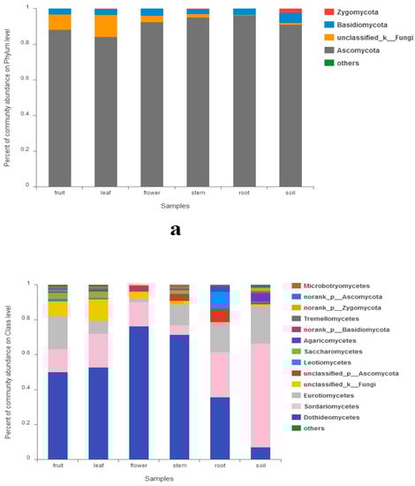 Fungal abundance in different organs and soil: (a) at phylum level; (b) at class level.