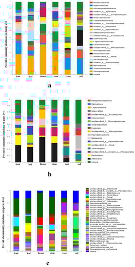 Fungal abundance in different organs and soil: (a) at family level; (b) at genus level; (c) at species level.